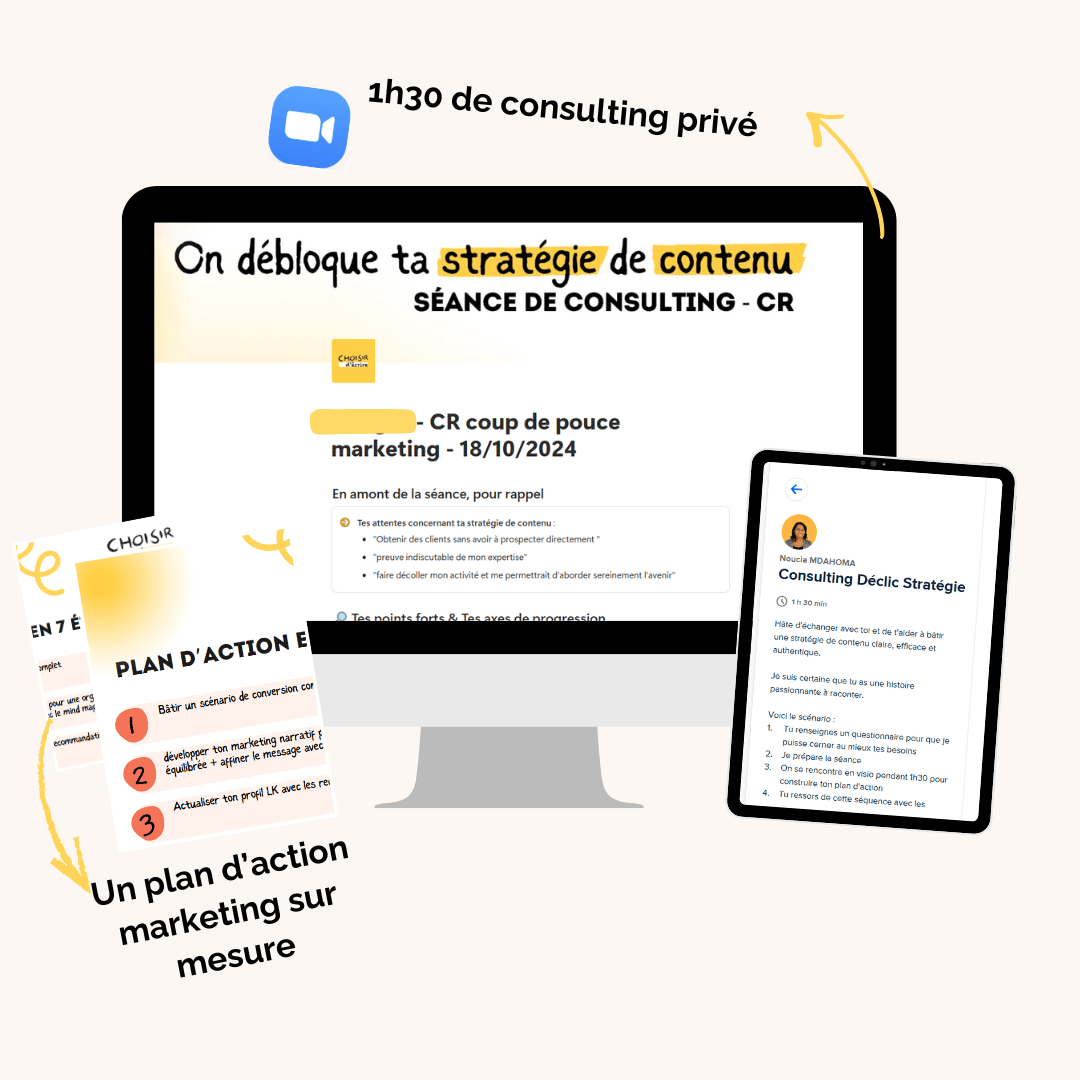 Je traduis tout ça en problématiques et solutions marketing alignées à ton business, ton rythme, ta personnalité.