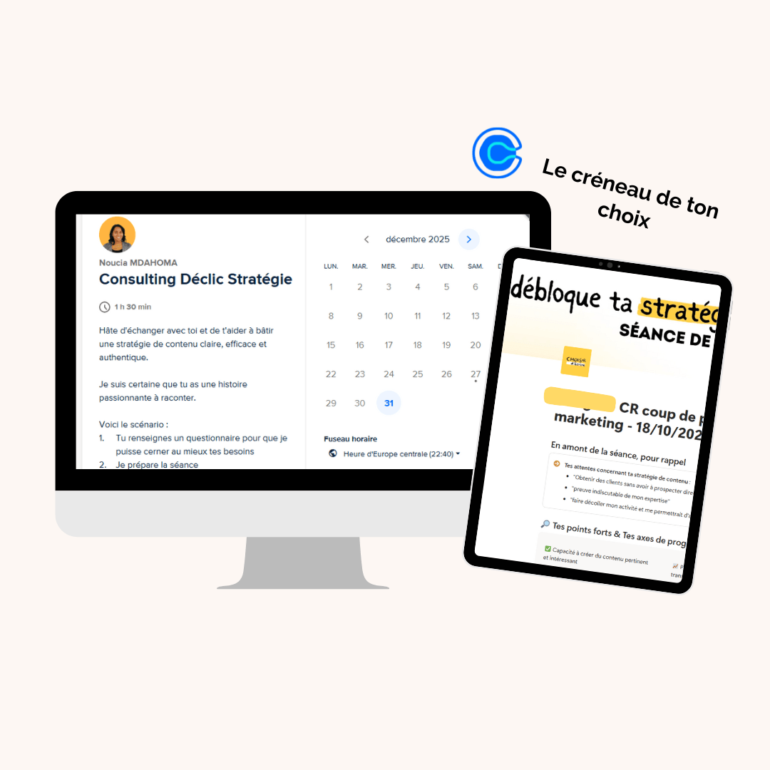 ➡️ C'est là que tu comprends que ce dont t'as vraiment besoin, c'est d'un joker. Celui du "coup de fil à un ami". Sauf que tous tes potes entrepreneures, les vrais, ne sont pas des pros du marketing. Déclic Stratégie, c'est ton coup de fil à ton alliée marketing, ton instant déblocage pour te relancer dans une dynamique saine, alignée. Pour retrouver de la clarté, remettre de l'alignement entre ta stratégie de contenu et tes objectifs, ta personnalité, ton rythme de vie. Sans te ruiner, sans engagement lourd. Une séance privée, safe dans laquelle tu peux poser tes questions et repartir avec un plan d'action sur mesure.
