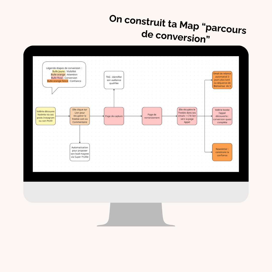 On designe ton parcours de conversion client ensemble en levant les freins identifiés. On construit la cartographie qui te servira de boussole stratégique.