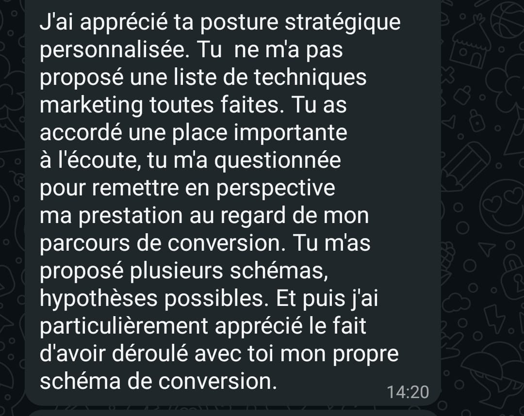 Ce que la séance m'a apportée : de la prise de recul et de la clarté. Le fait d'avoir abordé le parcours de conversion dans sa globalité et dans son aspect stratégique m'ont permis de le remettre en perspective avec toi.
